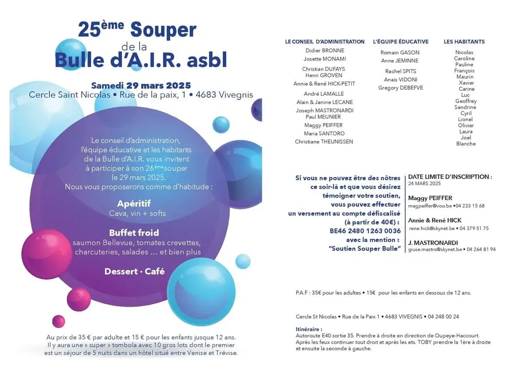 La Bulle d’A.I.R. vous invitent à participer à son 27ème souper le 21 mars 2026.